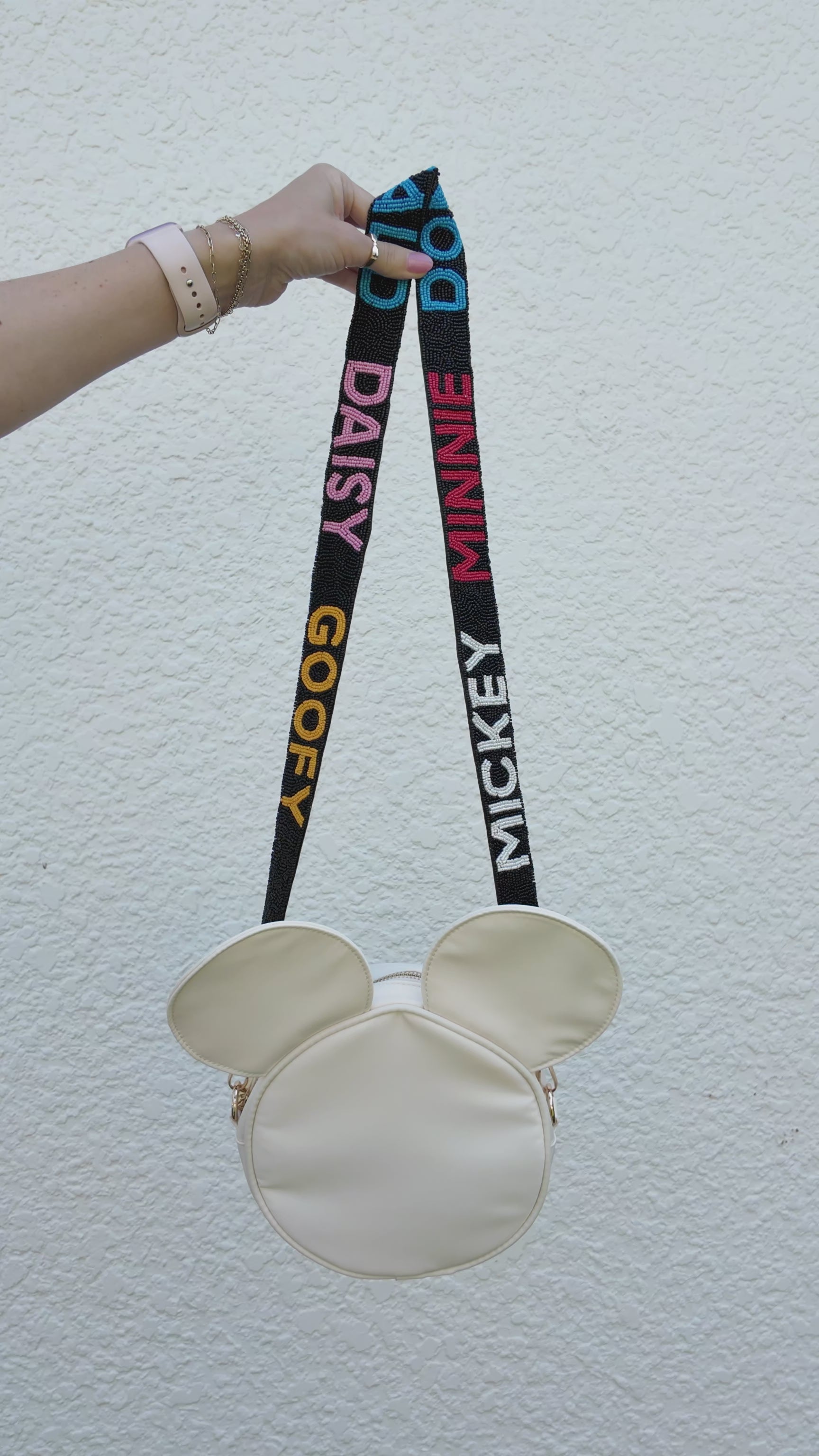 This bold black beaded strap features colorful name beads celebrating your favorite classic characters—Mickey in white, Minnie in red, Donald in blue, Daisy in pink, and Goofy in yellow. With luxe gold hardware and a 53" length, it clips onto any purse with connector rings for an instant pop of nostalgia and personality.